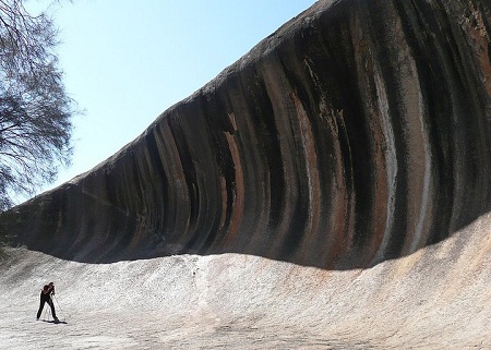 Australia to nie tylko Sydney i Uluru. Każdy jej kilometr to nowa przygoda, inny krajobraz i klimat. Przyroda tak odrębna, dzika i surowa, a jednak pachnąca wolnością.Wave Rock to jedna z najciekawszych formacji skalnych Australii Zachodniej i obowiązkowy przystanek dla każdego zainteresowanego choć w najmniejszym stopniu geologią i wrażliwego na piękno natury obieżyświata. Skała położona jest w pobliżu niewielkiej miejscowości Hyden, około 350 km na wschód od Perth – głównego miasta w stanie Australia Zachodnia. Przejazd zajmuje 4 godziny, jednak nie należy się śpieszyć. Region ten obfituje w przeróżne atrakcje: sędziwe lasy karri z przyprawiającymi o szybsze bicie serca wieżami strażniczymi, niedostępne wybrzeża, z których czasami dojrzeć można stada wielorybów, wyschnięte słone jeziora oraz gorące jak środek patelni pustynie. Tereny te zmieniają swoje oblicze z każdą porą roku – raz potrafią być nieprzyjazne, suche jak pieprz, monotonne i smagające chłodnym wiatrem. Innym razem ciepłe, rozkwitające tęczowo barwnymi dywanami i niesamowitymi kształtami kwiatów. Wyruszając na wschód z Perth po kilku chwilach wkraczamy do jednego z dziewięciu regionów Zachodniej Australii – Wheatbelt – słynącego ze złocistych łanów zbóż oraz przytulnych wiejskich farm i winiarni. Podróżując w tych rejonach nie sposób oprzeć się pięknu otaczających krajobrazów, jednak należy uważnie się rozglądać wypatrując kangurów, emu oraz olbrzymich waranów przekraczające drogę w najmniej spodziewanych miejscach. Tutaj o wypadek nietrudno – świadczą o tym obficie porozrzucane na poboczach ciała i szkielety martwych zwierząt. Wave Rock oznacza w dosłownym tłumaczeniu „Skalną Falę” i dokładnie taki wygląd ma owa formacja skalna. Nie jest gigantem, ale wysokość 14 metrów i długość około 110 sprawiają przytłaczające, surrealistyczne i zaprzeczające grawitacji wrażenie. Spacerując ścieżką u podnóży skały ma się wrażenie jakby oglądało się wyrzeźbioną, idealnego kształtu falę uchwyconą w momencie przybijania do brzegu. W okolicy poprowadzonych jest kilka ścieżek nie tylko w dolnej części słynnej skały ale również prowadzących na jej szczyt, z którego rozlega się przepiękny widok na otaczającą okolicę. Wave Rock to jedynie niewielki, północny fragment skały Hyden wyrzeźbiony na przestrzeni tysięcy lat. Hyden Rock obfituje w różnego rodzaju atrakcje geologiczne jak również florystyczne i faunistyczne. Spotkać tutaj można niezwykłe gatunki czworonogów i ptaków, dlatego warto zaopatrzyć się w lornetkę zanim wyruszy się w dłuższy spacer w okoliczne zakątki. Wave Rock zbudowana jest z granitów – skał pochodzenia wulkanicznego. Całość obejmuje kilka hektarów. Swój rozpoznawalny na pierwszy rzut oka kształt zawdzięcza głównie erozji wodnej, w mniejszym stopniu wietrznej, która przez tysiące lat podcinała podstawę skały wykuwając jej obecny, piękny kształt. W podobnej postaci trwa tutaj już od ponad 60 mln lat pamiętając ostatnie dinozaury, jednak skały budujące formację mają nawet 2,7 miliarda lat. Wertykalne, kolorowe - czarne, pomarańczowe i żółte pionowe pasma powstały dzięki działalności deszczu wypłukującego związki żelaza i inne minerały z wyższych pięter formacji i osadzając je poniżej. Niesamowite barwy warte są obejrzenia o różnych porach dnia, przy zmiennej temperaturze światła i jego natężeniu. Najrozmaitsze oblicza skalnego giganta ucieszą nie tylko oczy wrażliwego turysty ale będą także świetną okazją dla wykazania się fotografom. Niedaleko Wave Rock znajdują się może nie tak okazałe, ale równie piękne formacje zwane Hippos Yawn, Breakers i The Humps. Dotrzeć do nich można wybierając jedną z kilku ścieżek u podnóży Wave Rock. Mniejsze, choć podobnego pochodzenia co prehistoryczny klejnot, którym niewątpliwie jest „Skalna Fala” Hippos Yawn zawdzięcza swą nazwę podobieństwu do olbrzymiej paszczy hipopotama. Piękno skał podziwiać można nie tylko wspinając się na kamienie otaczające owe „szczęki”, jak również wchodząc do ich środka i zwiedzając przesmyk, który powinien być przełykiem hipopotama.Wave Rock ma jednak nie tylko turystyczne i estetyczne znaczenie. W połowie ścieżki na szczyt skały znajduje się zbiornik retencyjny zbierający wodę opadową, wykorzystywaną podczas suszy. Nieprzepuszczalne skały stanowią idealne podłoże dla wody, która nie może przeniknąć w głąb gruntu. W najbliższej okolicy Wave Rock raz do roku, pod koniec września odbywa się festiwal muzyczny „Wave Rock Weekender”. To jedyna w swoim rodzaju impreza muzyczna w Australii. Każdy kto zdecyduje się brać w niej udział może nastawić się na różnorodne doznania dźwiękowe – od muzyki etnicznej po New Age, olbrzymi kamping z wszystkimi udogodnieniami, dużą ilość filmów oraz olbrzymi basen ze słoną wodą. Skała została również rozreklamowana przez niezliczone filmy promujące Australię oraz komercyjne seriale telewizyjne jak choćby Japan’s Next Top Model. Samo Hyden jest mikroskopijne, jednak to wspaniałe miejsce by nacieszyć się pięknem okolicznej przyrody i podjąć decyzję gdzie ruszyć dalej. W samym centrum miasteczka atrakcją wartą obejrzenia jest park stojących na wolnym powietrzu rzeźb skonstruowanych ze starych części samochodowych. Wśród najciekawszych z nich znajduje się szczerbaty koń z wybałuszonymi oczami oraz pijanym ranczerem na grzbiecie, wystraszona kolczatka szukająca w panice kryjówki oraz zabłąkany górnik lub listonosz na rowerze. Znaleźć można tutaj baletnicę, matkę z dzieckiem, beczkowóz, zaprzęg rowerowy, farmerów oraz niezliczoną ilość innych postaci - w zależności od tego jak bogata jest nasza wyobraźnia. Niedaleko znajduje się równie ciekawy park zwierząt. Niewielką,